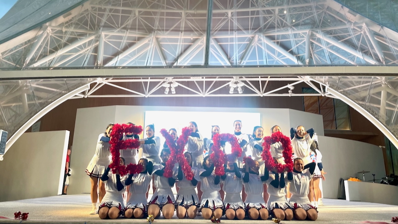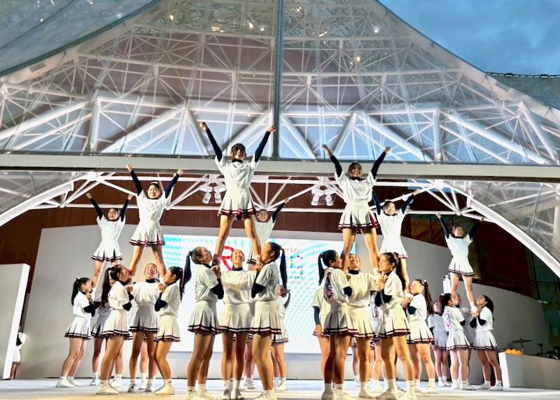 大学の能楽部、応援団、交響楽団などによる華やかな発表が続く中、本校からはバトントワリング部とチアリーダー部が出演し、大学生とのコラボレーション演技に挑戦しました。ステージ上では、笑顔とエネルギーあふれる熱演が繰り広げられ、観客から大きな拍手が送られました。