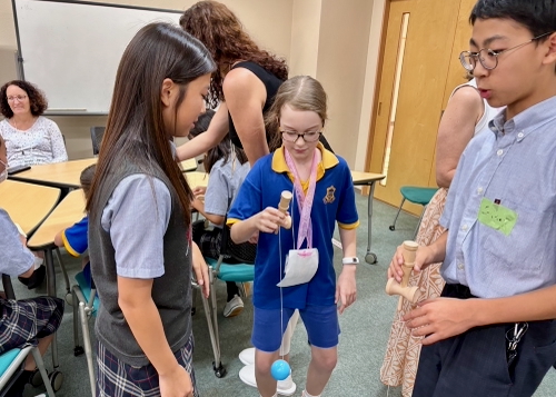 LHRの時間を活用して行われた歓迎セレモニーでは、吹奏楽部による温かい演奏から始まり、スクールギフトの贈呈やクイズ大会で和やかな雰囲気に包まれました。さらに、オーストラリアの児童たちが元気いっぱいのダンスを披露し、会場は大きな拍手と歓声に包まれました。また、本校美術教員によるワークショップでは、銀箔の硫化変色を利用した模様づけに挑戦。児童たちは興味津々の様子で日本ならではの伝統技法を楽しみました。放課後には、国際委員のメンバーが中心となり、けん玉や折り紙といった日本の伝統的な遊びを通して交流を深めました。
