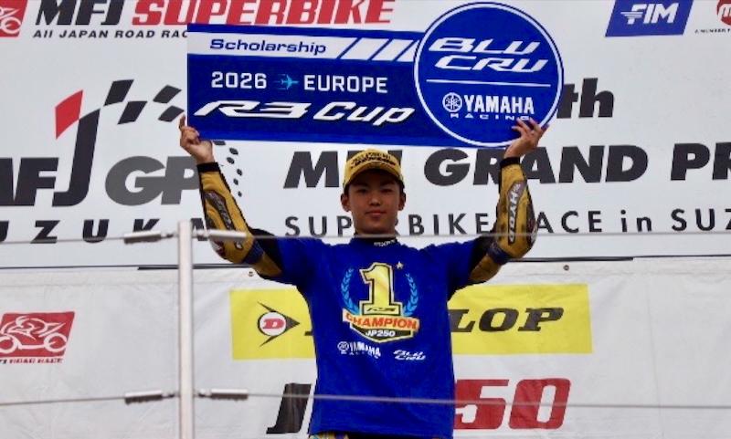 本校高校2年生の竹本倫太郎さんが、国内ロードレース「JP250」クラスにおいて年間チャンピオンの座を獲得しました。さらにこの功績が認められ、YAMAHAスカラシップの選出を受け、2026年にはヨーロッパで開催される「YAMAHA R3 bLU cRU FIM World Cup」への参戦が決定しました。