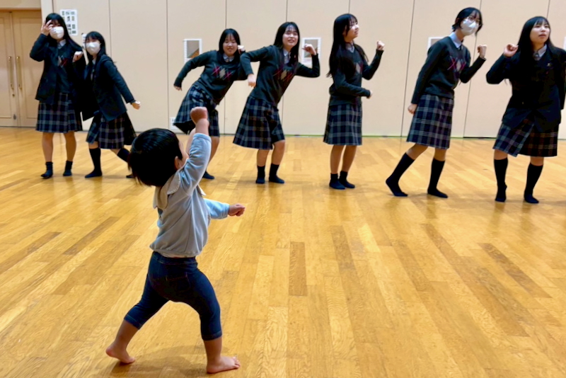 当日は3人の幼児と一緒に、参加した中学生たちがダンス、手遊びうた、ハイハイレース、お散歩など、様々なアクティビティを通して交流を深めました。