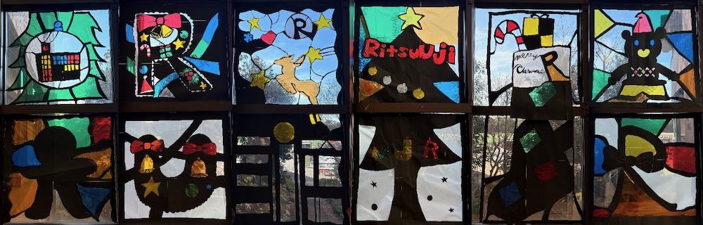 中学文化委員会が「立宇治×クリスマス」をテーマにステンドグラスを制作しました。校舎の上にいるトナカイや、プレゼントが入ったRソックス、サンタ帽をかぶり立宇治のベストを着たクマなど、立宇治らしさとクリスマスの雰囲気を組み合わせたデザインが見どころです。