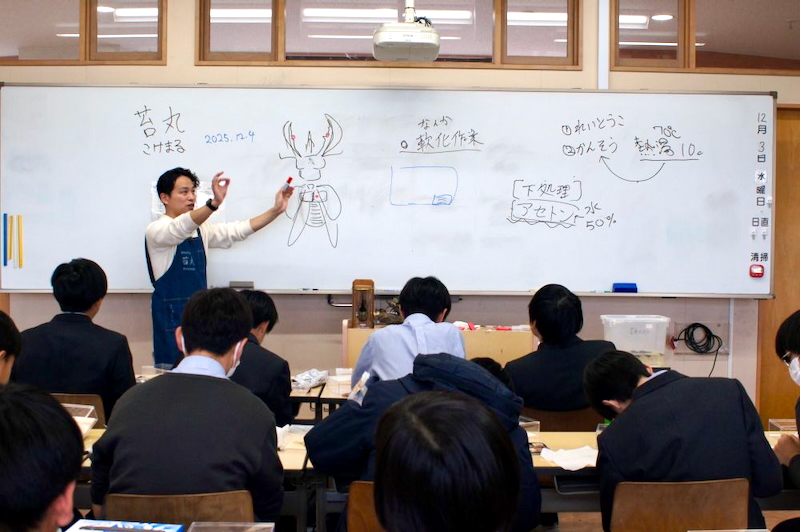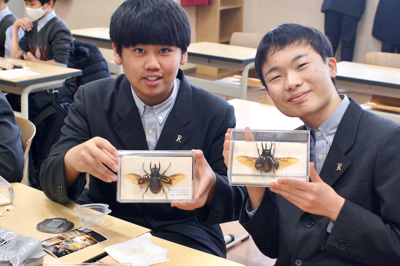 講師には、昆虫標本専門店「苔丸」の近藤様をお迎えし、本格的な標本作りの技術を学びました。参加した生徒たちは、外国産の立派なクワガタやカブトムシを前に目を輝かせ、興味津々の様子でした。