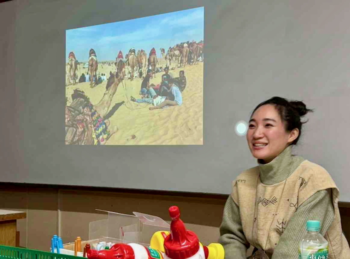 今回は インドでラクダの毛刈りアーティストとして活躍されている武市萌美さん をお迎えし、インドの文化や暮らし、そして武市さんのユニークなお仕事について写真や動画を交えながらお話をうかがいました。日本ではなかなか知る機会のないインドの日常や、ラクダの毛刈りという仕事の背景に、生徒たちは興味深く耳を傾けていました。