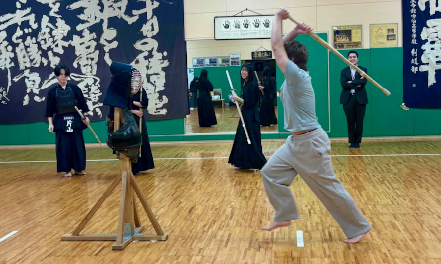 また、和太鼓や茶道、剣道部での体験活動にも取り組みました。和太鼓では力強い音とリズムを全身で感じ、茶道では礼儀や所作に込められた日本の心を学びました。剣道部での体験では、礼に始まり礼に終わる武道の精神に触れ、日本の部活動文化の一端を体感しました。