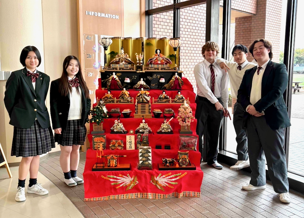 今回の飾り付けでは、留学生たちが一体一体の人形や調度品を丁寧に並べながら、雛人形の意味や飾り方について学びました。人形や小道具の精密な作りに驚きながら、日本文化への理解を深める貴重な機会となりました。完成した七段飾りは、B棟玄関を華やかに彩り、校内に春の訪れを感じさせる温かな雰囲気をもたらしています。