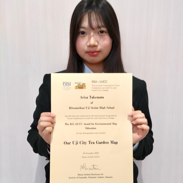 今回の受賞は、宇治市のお茶栽培をテーマに制作した地図作品「私たちの宇治市、茶畑MAP」が、第35回「私たちの身のまわりの環境地図作品展」においてIGU-LUCC議長賞を受賞したことによるものです。この作品は、宇治市の特色である茶畑の分布や地域の環境について、調査結果をもとに分析・考察した地図作品で、地域の特色を丁寧に調べ、わかりやすく表現している点が高く評価されました。
