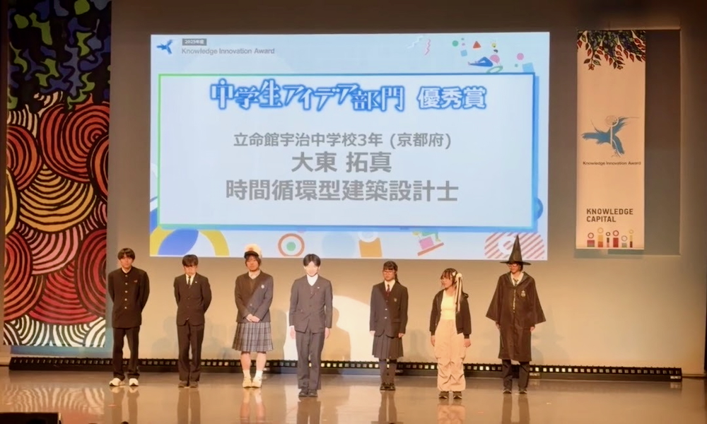 3月20日(金),グランフロント大阪ナレッジシアターにて開催された「第13回ナレッジイノベーションアワード」中学生アイデア部門において,3年の大東拓真さんが優秀賞を受賞しました。応募総数1668作品の中から選出され,グランプリ,準グランプリに次ぐ栄誉ある賞です。