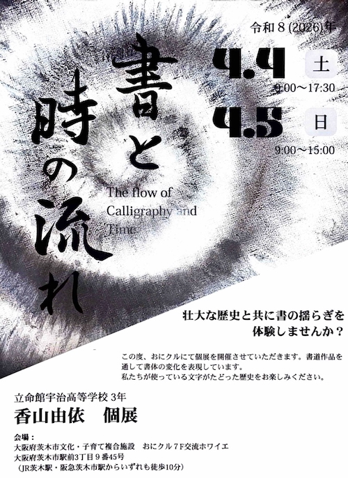 | 本校書道部に所属する香山由依さん(IBコース3年)が、4月4日、5日におにクル(大阪府茨木市駅前)にて個展「書と時の流れ~ The flow of Calligraphy and Time」を開催します。 書道作品を通して、書体の変化を表現しています。私たちが使っている文字がたどった歴史をお楽しみください。 |