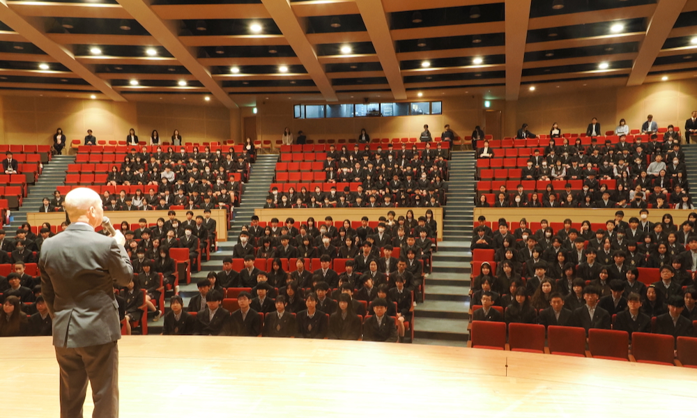 また、西田教頭からは、本校のテニスコート奥に新設された高校生徒寮RUDの利用方法について説明があり、立命館が学園全体として、学びの環境を整えてきていることの説明があり、「平和と民主主義」を教学理念とする立命館で、「グローバルリーダーとなるみなさんは、自分のためだけではなく、社会全体に貢献できるようこの環境を活かしてほしい」と期待が述べられました。