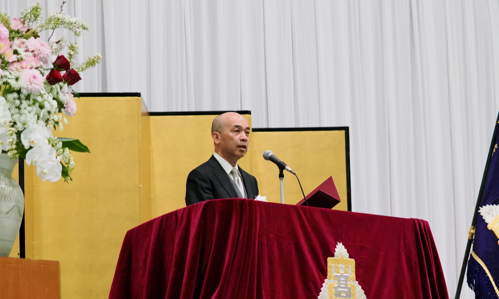 その中でも、AIが進展する現代において特に重要なのはInitiative(自発性)であると強調しました。自ら関心のあることに動き出し、自分で目標を定めて挑戦すること、楽な方に流されず困難にも立ち向かうこと、そして失敗しても立ち上がり再び行動することが人の成長につながると述べました。さらに、その主体的な行動が周囲にも広がり、大きな力となっていくとし、新入生に対して、勇気を持って挑戦し、最後までやり抜くことへの期待と激励の言葉を送りました。
