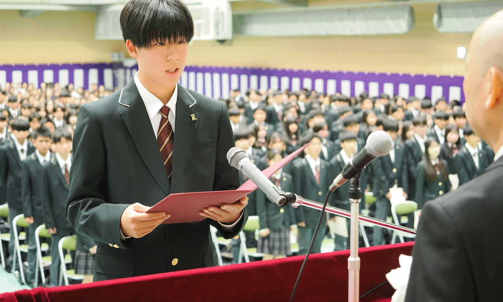 続いて、新入生代表の中井康暉さんが宣誓を行いました。「新たな出会いに大きな期待を抱いている」と述べるとともに、「グローバルな学びができるこの学校で、多様な価値観に触れ、自らの視野を広げ、世界に通用する人へと成長していきたい」と決意を表明しました。また、「この素晴らしい環境の中で、学業と部活動の両立に全力で取り組むことに感謝し、文武両道を目指します」と力強く締めくくりました。