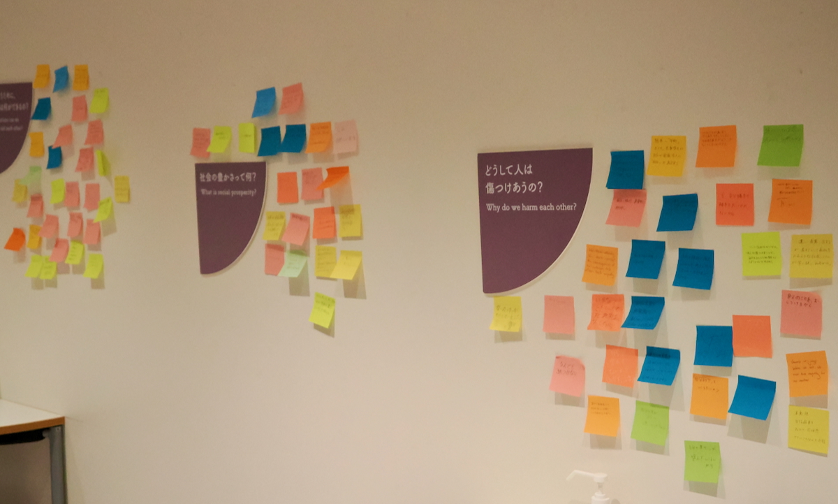 展示を一周すると、最後に「問いかけ広場」という白い空間があります。「あなたにとってのピースのかけらは何か見つかりましたか?」という問いに対して、生徒たちが付箋に自分の思いを書いて壁に貼っていきます。そして、このメッセージが次の来館者の目に触れ、「なるほど、でも自分ならこう思う」という新たな思考が生まれる。来館者同士の静かな対話が、自然とつながっていく仕組みです。