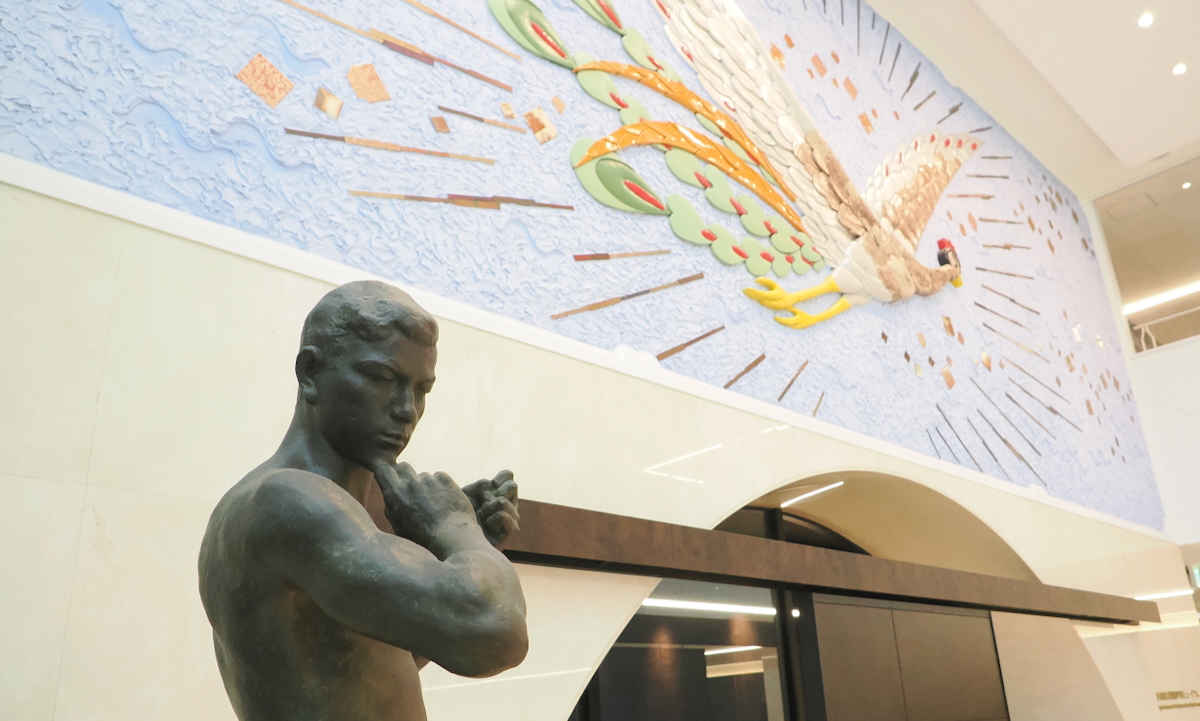 1階エントランスホールに設置されている「わだつみ像」と「火の鳥((株)手塚プロダクションご提供)」