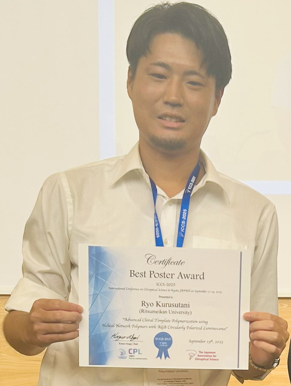| 38 | 2025年9月17-19日に京都・歴彩館で開催された「キラル光学科学に関する国際会議 (ICCS-2025)」において、来守谷亮君 (生命科学研究科・生命科学専攻M2、花﨑研) が 「"Advanced Chiral Template Polymerization using Helical Network Polymers with RGB Circularly Polarized Luminescence"」の内容で優秀ポスター賞を受賞した。 |