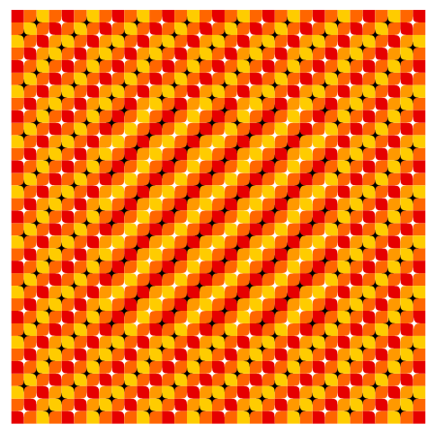 同心円配置の星型が渦巻き配置に見える。真ん中を見ながら目を近づけたり遠ざけたりすると図全体が回転して見える。