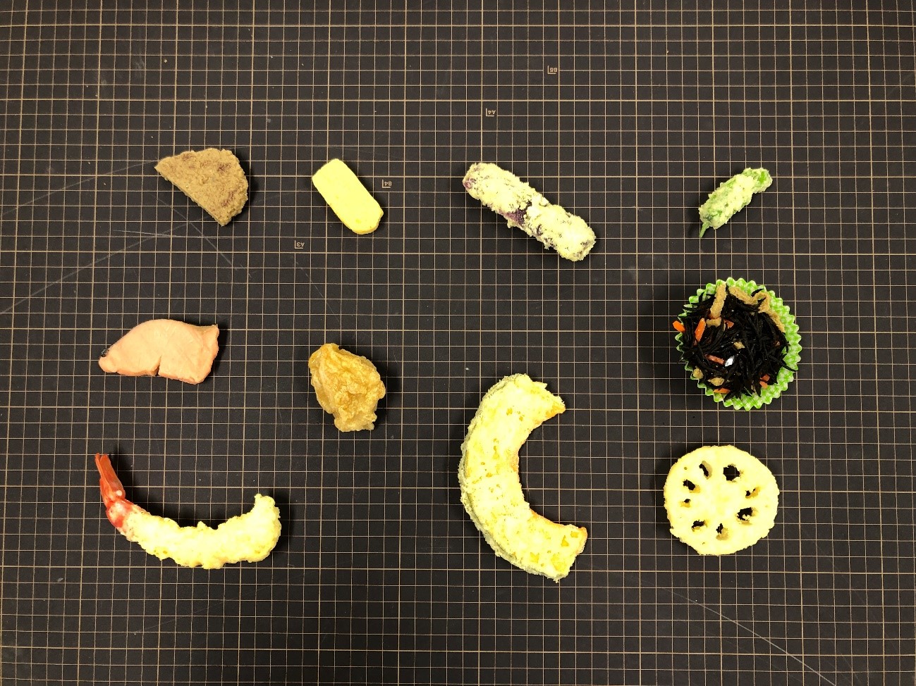 The handling targets are 10 categories of food samples. Weight of each sample is below 100 g. Refer the cutter mat for the size of the targets. The interval of the lattice is 10 mm. The physical properties, including softness and geometry, of the food samples are very close to the real ones. However, it does not come with oil or moisture like the real ones do.