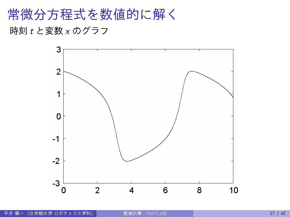 | 第2週 | 4/13 | MATLAB 行列とベクトル,常微分方程式,グラフ,パラメータの引き渡し |