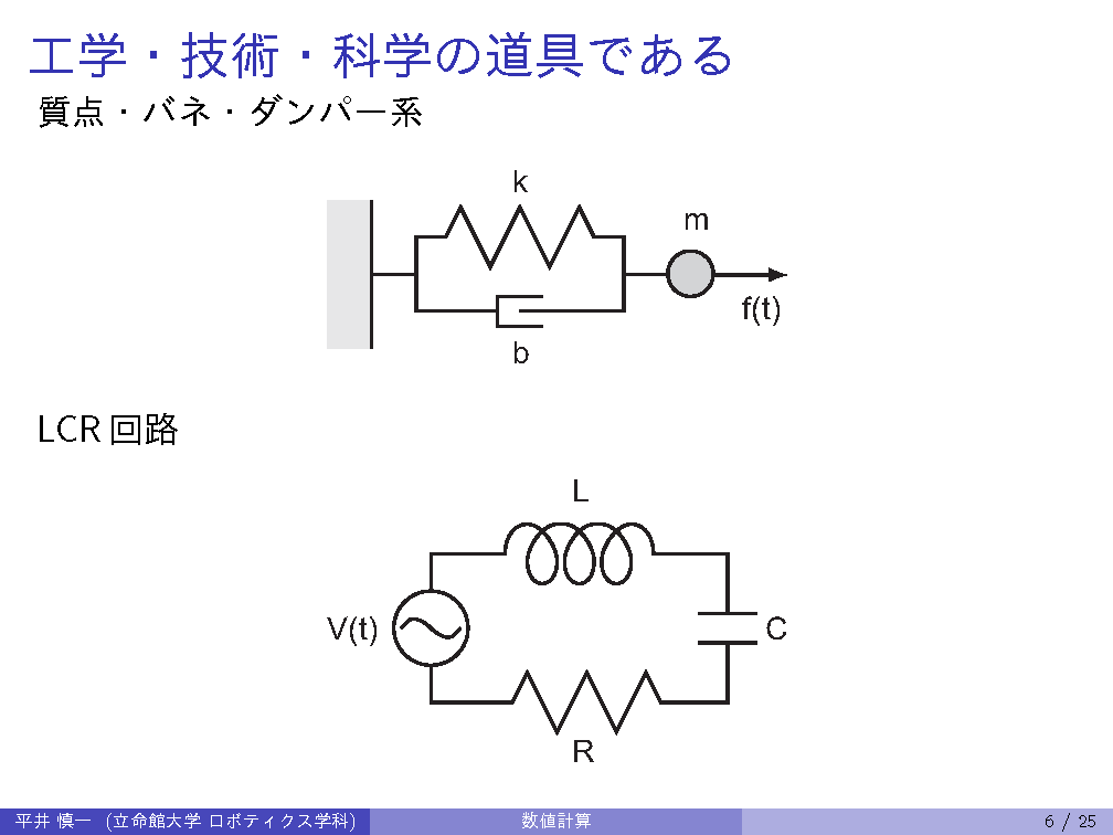 | 第3週 | 4/20 | 常微分方程式 常微分方程式の標準形,状態変数,ルンゲ・クッタ法 |