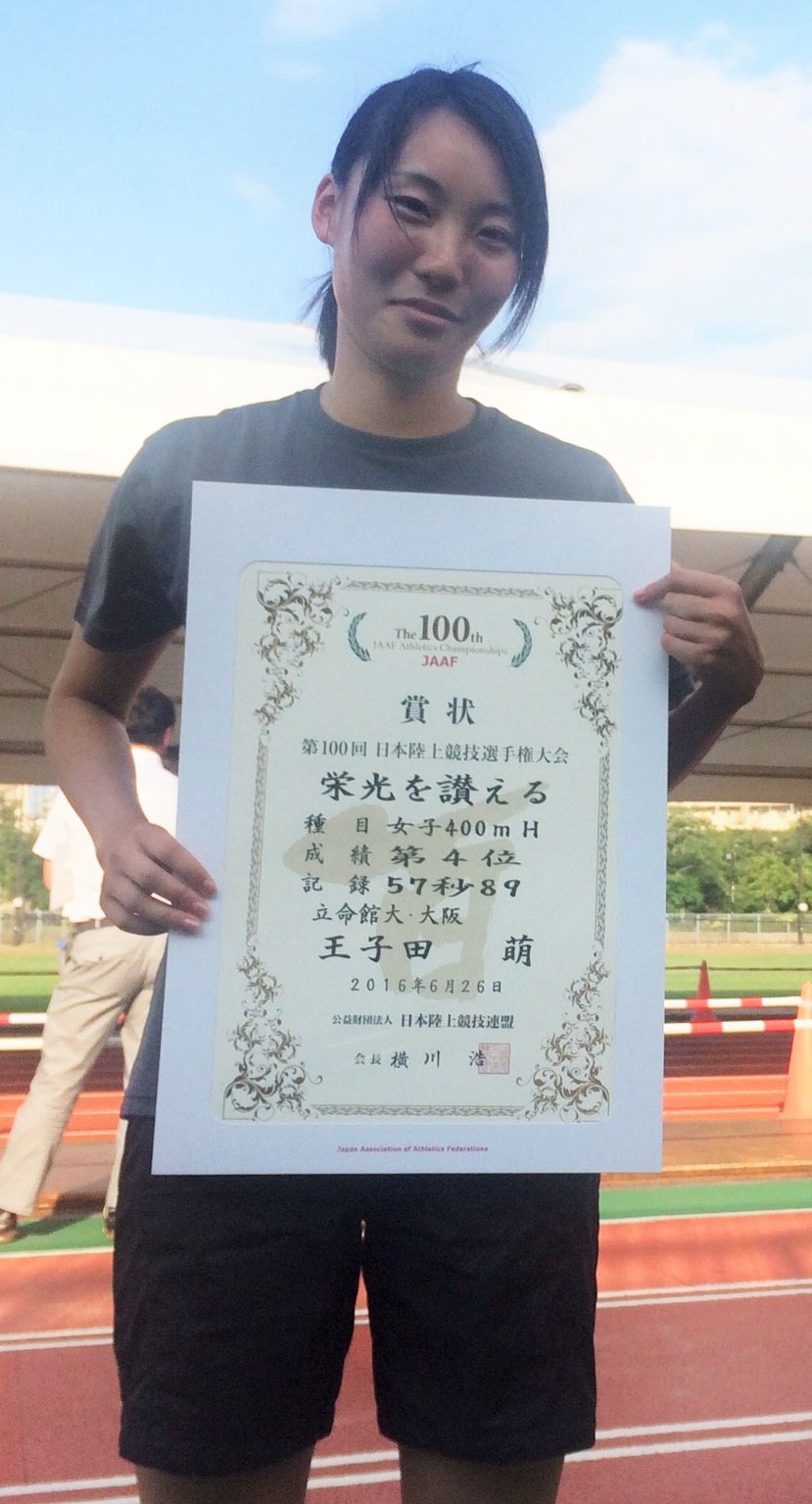 2016年6月 第100回日本陸上競技選手権大会にて王子田萌さんが400mHで第4位に入賞しました。