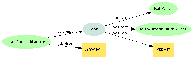 <rdf:RDF xmlns:rdf="http://www.w3.org/1999/02/22-rdf-syntax-ns#" xmlns:dc="http://purl.org/dc/elements/1.1/" xmlns:foaf="http://xmlns.com/foaf/0.1/"> <rdf:Description rdf:about="http://www.unchiku.com/"> <dc:creator> <foaf:Person> <foaf:mbox rdf:resource="mailto:inabauer@unchiku.com"/> <foaf:name>稲葉光行</foaf:name> </foaf:Person> </dc:creator> <dc:date>2006-09-01</dc:date> </rdf:Description> </rdf:RDF>これを RDF グラフで表すと以下のようになる。
