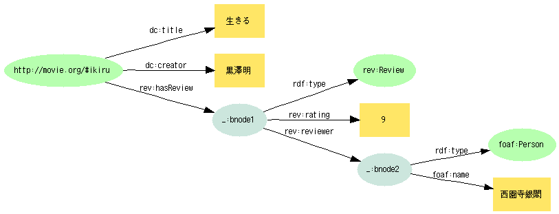 <rdf:RDF xmlns:rdf="http://www.w3.org/1999/02/22-rdf-syntax-ns#" xmlns:dc="http://purl.org/dc/elements/1.1/" xmlns:rev="http://www.purl.org/stuff/rev#" xmlns:foaf="http://xmlns.com/foaf/0.1/"> <rdf:Description rdf:about="http://movie.org/#ikiru"> <dc:title>生きる</dc:title> <dc:creator>黒澤明</dc:creator> <rev:hasReview> <rev:Review> <rev:rating>9</rev:rating> <rev:reviewer> <foaf:Person> <foaf:name>西園寺銀閣</foaf:name> </foaf:Person> </rev:reviewer> </rev:Review> </rev:hasReview> </rdf:Description> </rdf:RDF>これを RDF グラフで表すと以下のようになる。