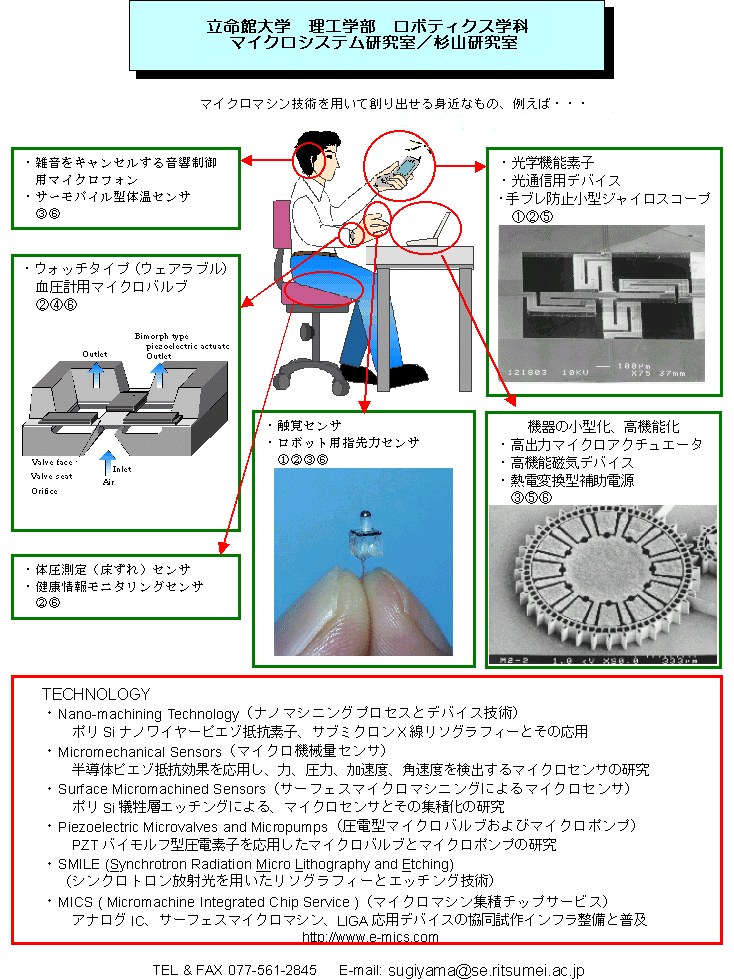 マイクロロボット、マイクロマシン、マイクロセンサのデザイン、製法の研究。世界的に有名な本学のシンクロトロン放射光を使ってマイクロ加工をしています。人間の五感であるセンサと、頭脳であるマイクロコンピュータと、手足となるアクチュエータを数ミリ角のシリコンチップ(ICの基板)上にミクロン以下の寸法精度で作り上げ、いろいろな仕事(分析、計測、反応、情報変換、刺激など)をさせるマイクロチップのデザインや応用を研究しています。将来人間に近いロボットに組み込まれる重要なパーツやエンジンになるでしょう。
