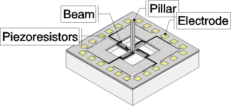 ◆ 本ジャイロスコープの構造は、断面積50 μm×50 μm、有効長1575 μmの4本の折り返されたビームを十字に配置して、ビームの中央に100 μm角、長さ1000 μmのピラーが設けられている。それぞれのビームの最大応力が発生する部位に、ピエゾ抵抗素子が形成されており、電極はチップ周辺に設置されている。また、チップサイズは3 mm×3 mmである。さらに、駆動方法は、異なる2つの固有振動モードを組み合わせ、位相をずらしてビームを共振させることにより、ピラーを旋回円運動させる(Fig.1)。