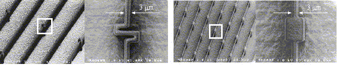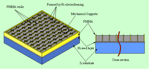 Fig.2@SEM images of magnetic core after Ni electroforming. PMMA walls with 100 micrometer-height, 3 micrometer-width, 4 millimeter-length in maximum aspect ratio of 33.