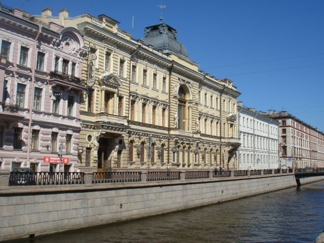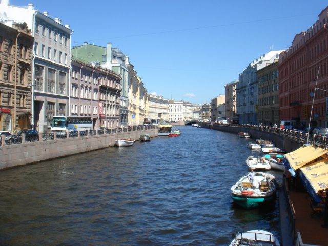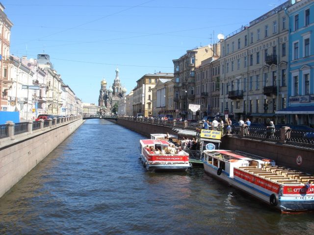 | ネフスキー大通りを横切る運河。手前は遊覧船サービス。奥に見えるのは、スパス・ナ・クラヴィー聖堂 | |