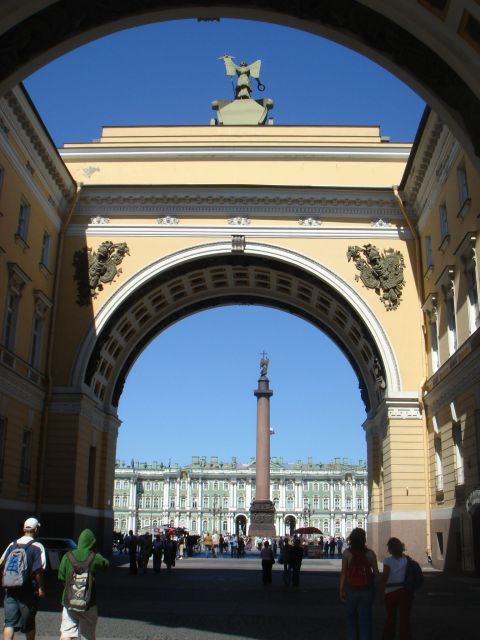 | 旧参謀本部のアーチ下から、宮殿前広場のアレクサンドルの円柱をのぞむ | |