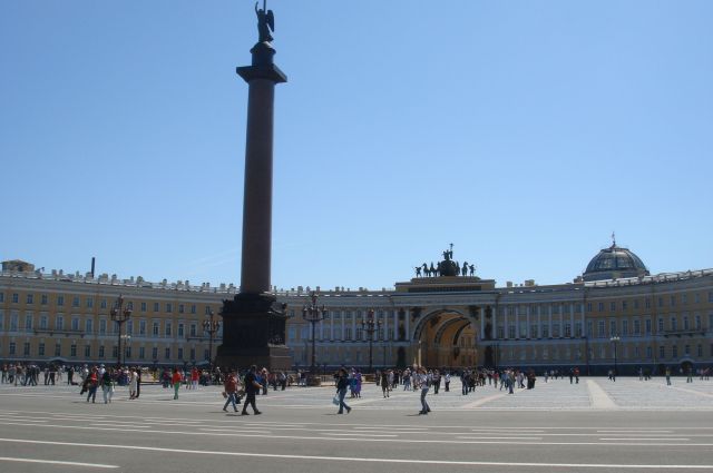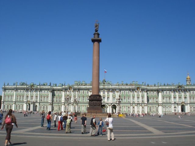 | 宮殿前広場のアレクサンドルの円柱。向こう側がエルミタージュ美術館。 | |