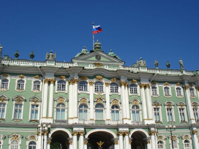 | エルミタージュ美術館正面。 トップに輝くロシア国旗。 |