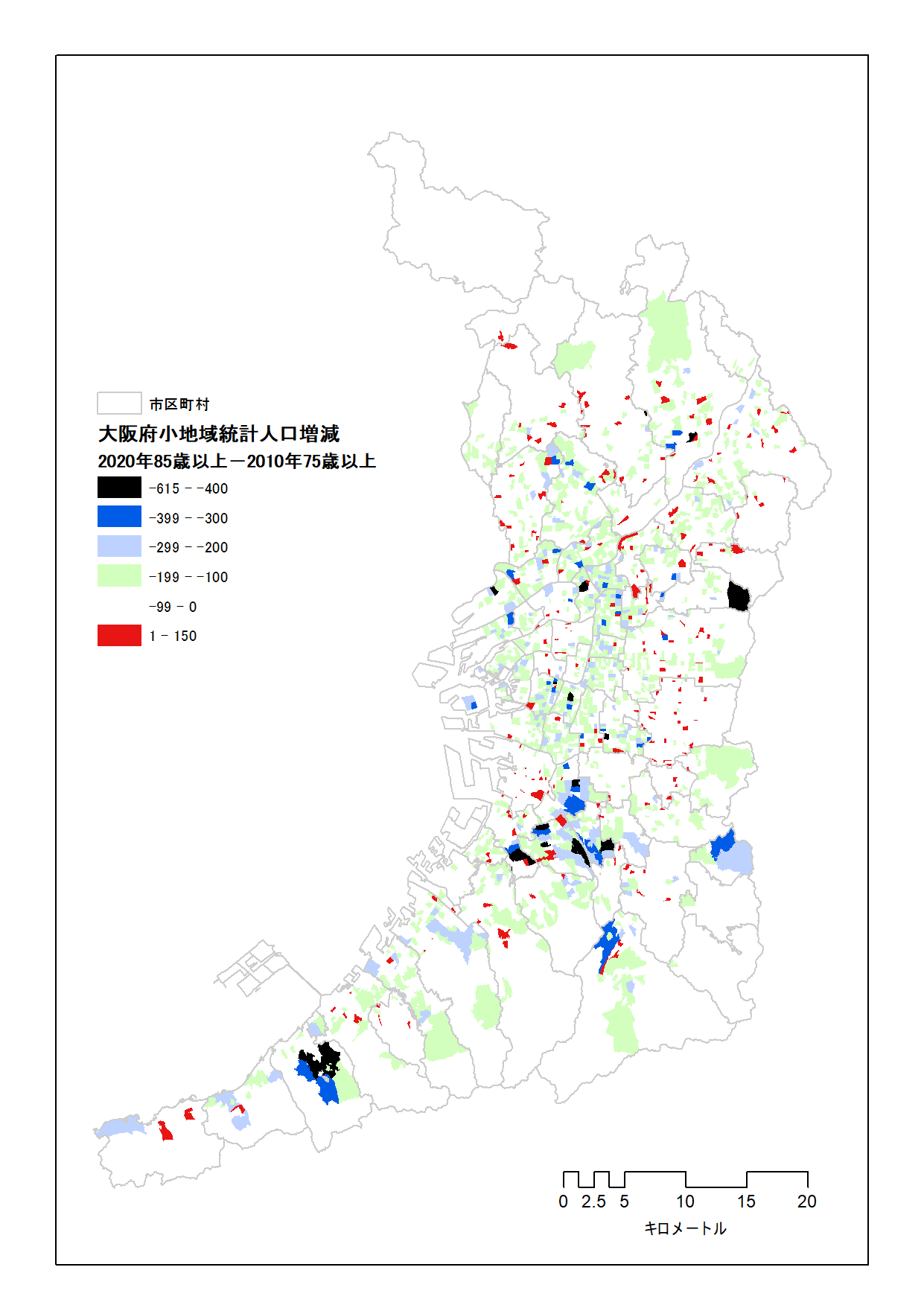図 大阪府の後期高齢者の減少地区(2010年の75歳以上人口を2020年の85歳以上人口から引き算したもの)